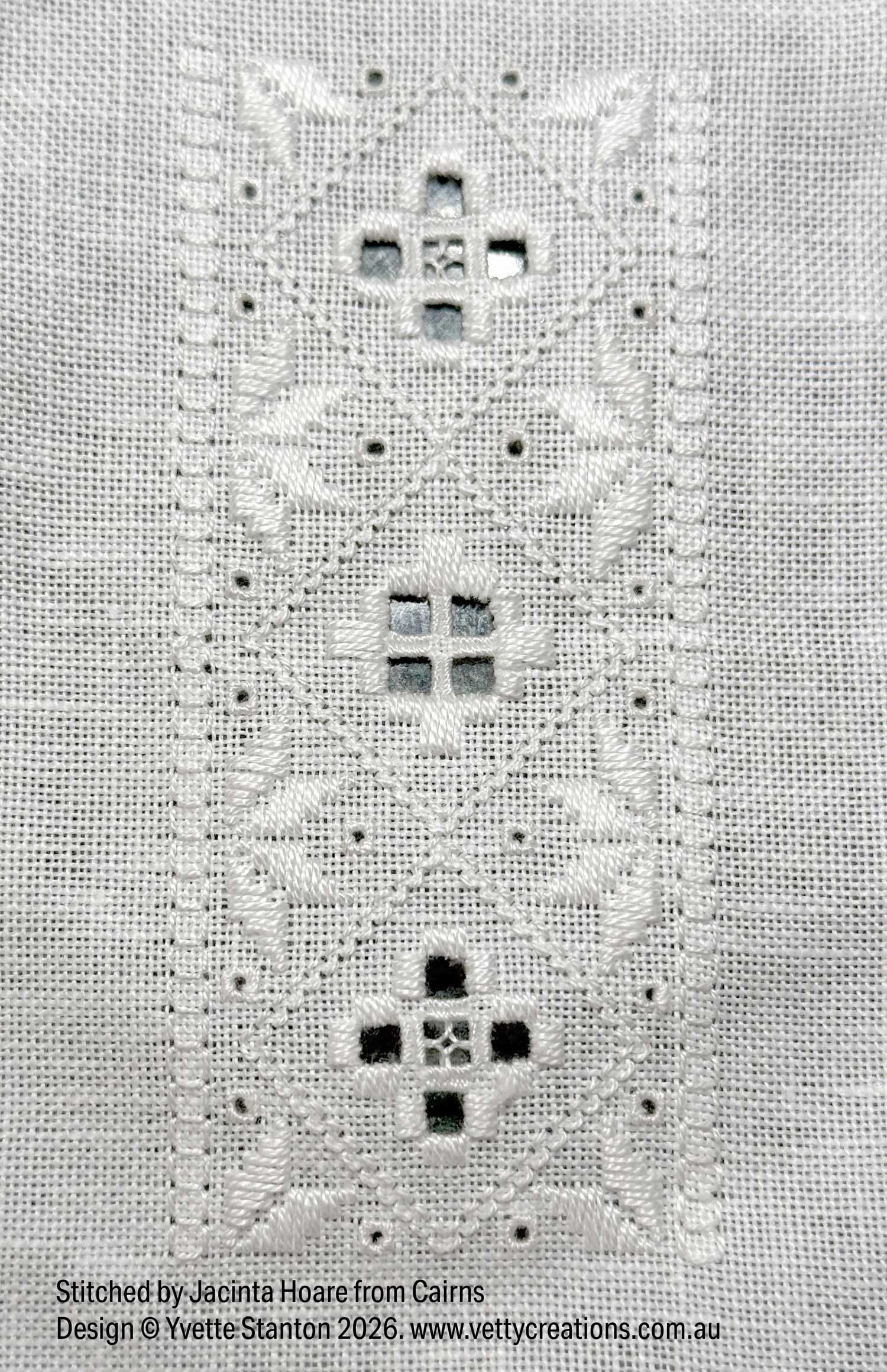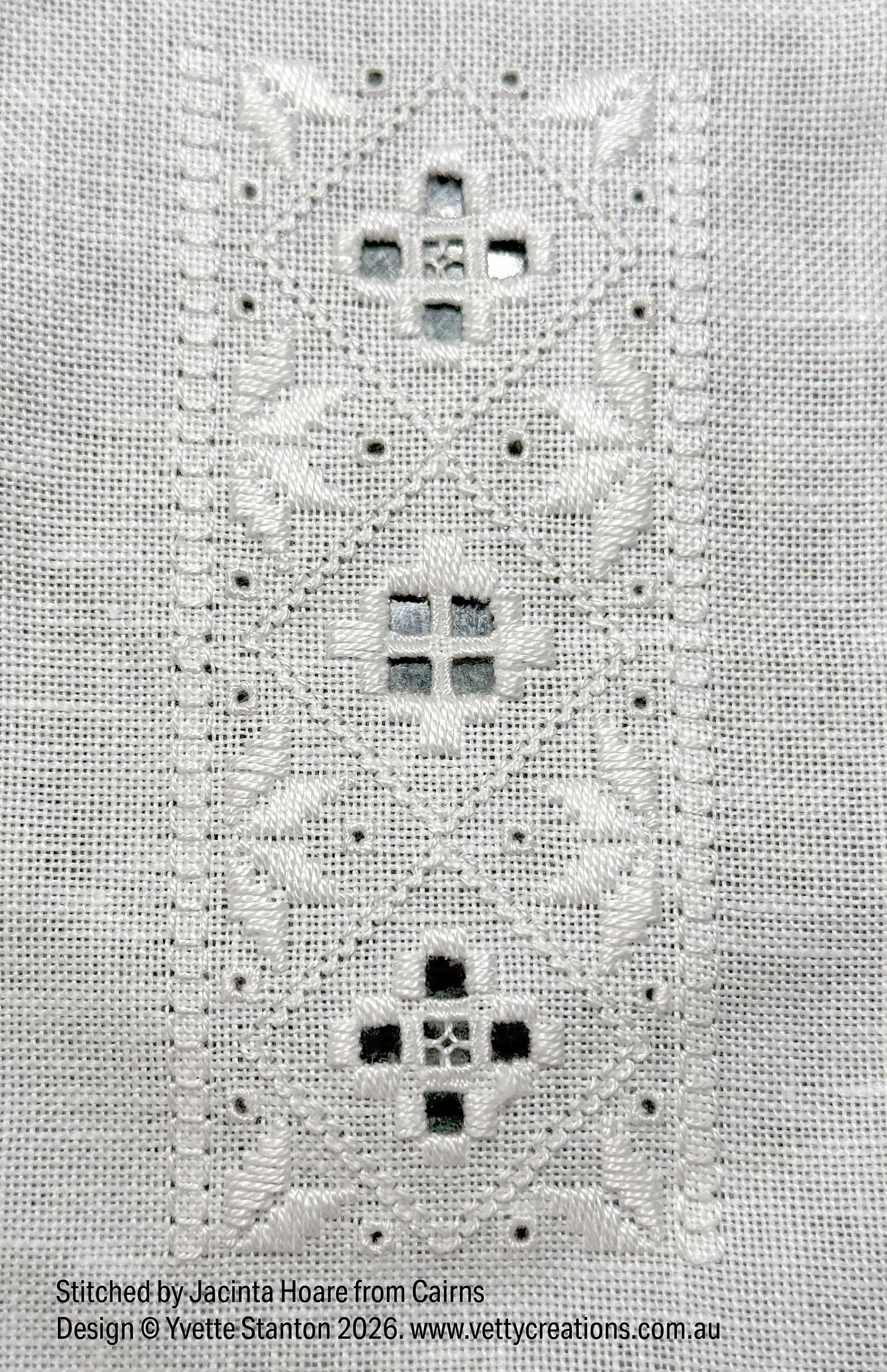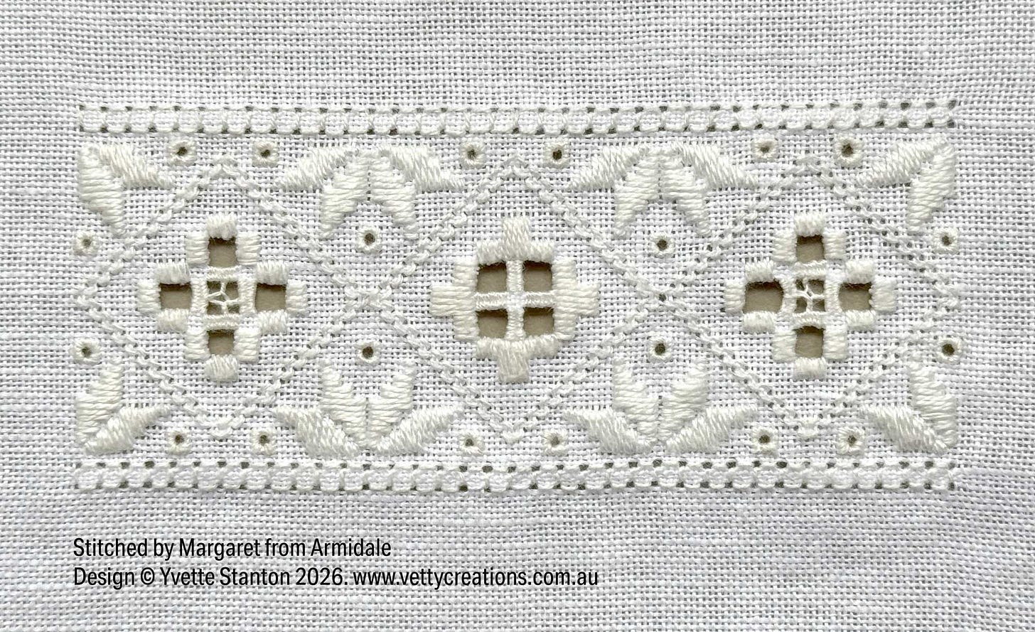 Next, we had Jacinta from Cairns, who sent me this photo only about a week after my recent beginners Hardanger class ended! She had this to say, “While it’s far from perfect I’m not going back to fix the eyelets that could be improved upon. They show a journey and progress is better than perfection.” I heartily agree, Jacinta, and you’ve stitched it beautifully.